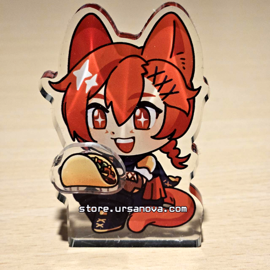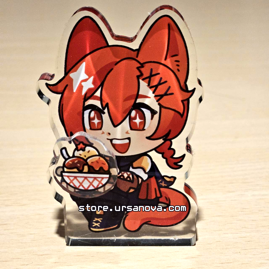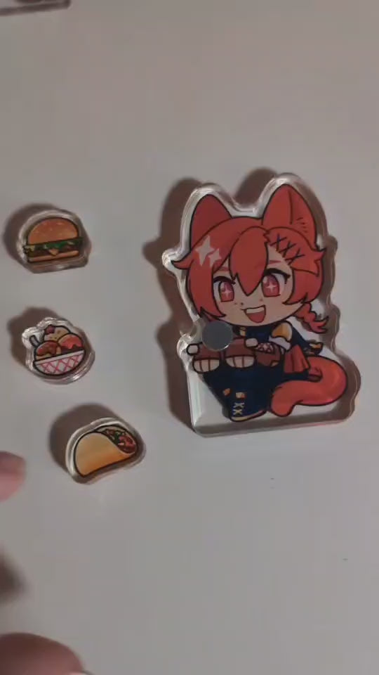 A 4-piece standee that includes a 7cm chunky acrylic block featuring G'raha from FFXIV with three mini acrylic snack pieces. Each piece contains magnets, so you can swap the food in his hands!