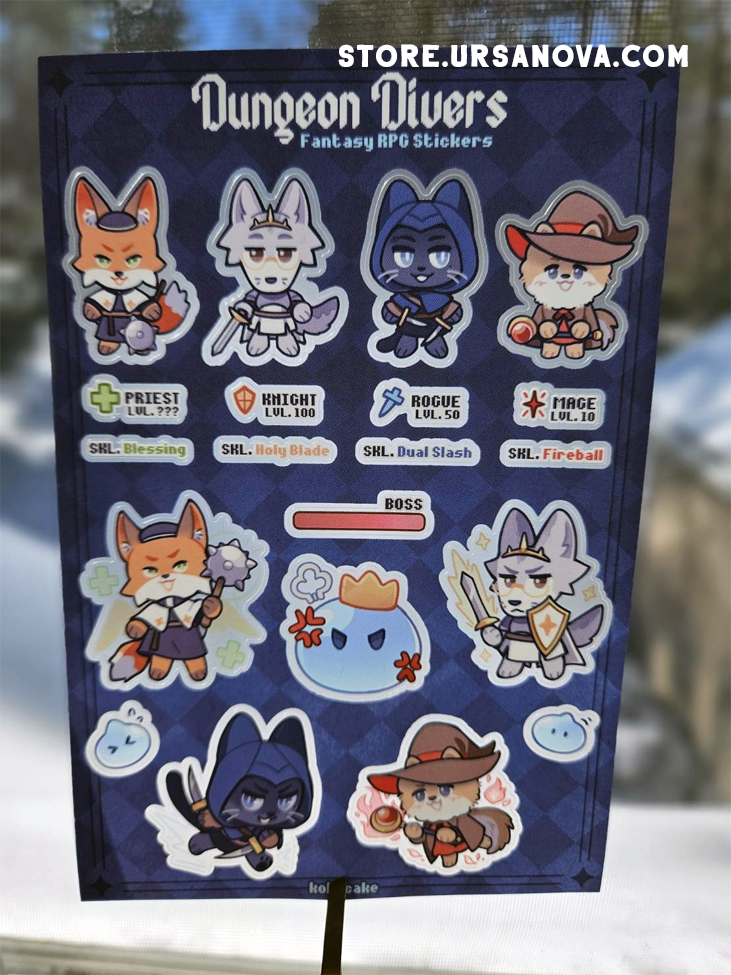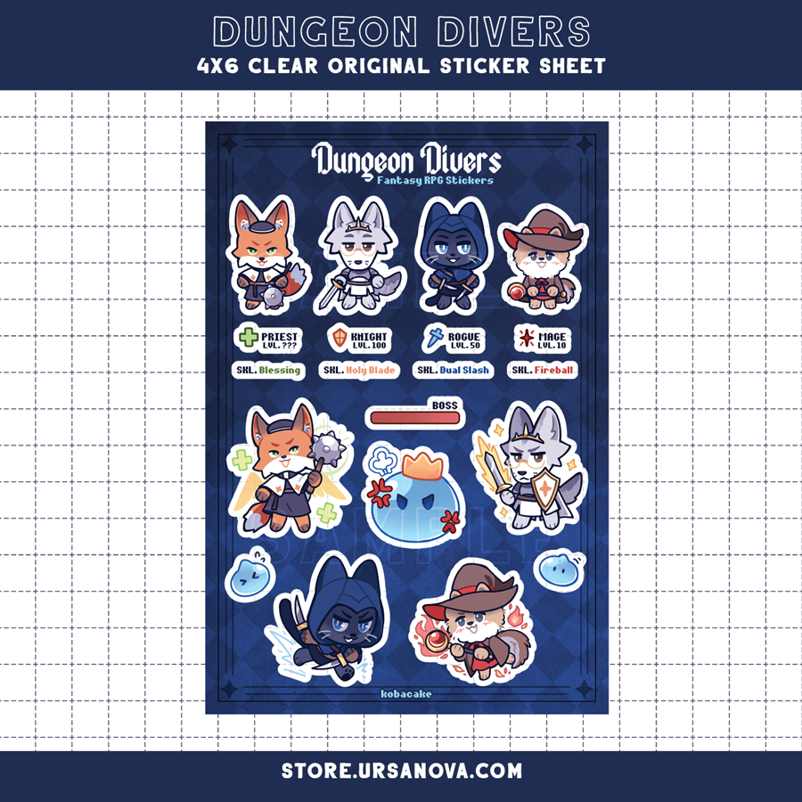 A 4x6 clear vinyl sticker sheet featuring an animal adventuring party: a Fox Priest, Wolf Knight, Cat Rogue, & Dog Mage.